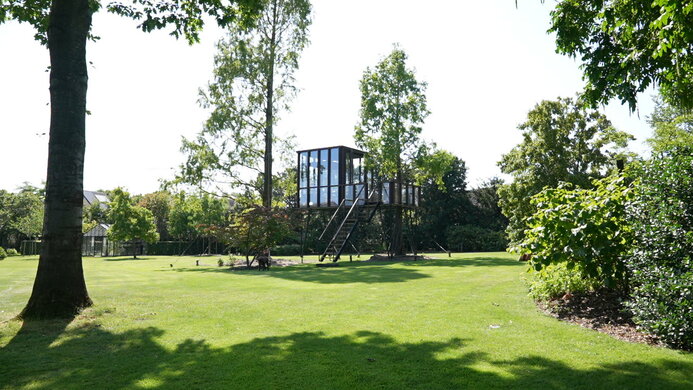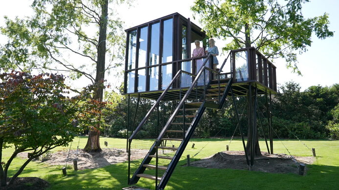 Korkeatasoinen, hienostunut versio klassisesta lapsuusprojektista. HogerHuis valmisti tämän modernin ja hienostuneen mallin Afzelia-puusta. Siinä on lattiasta kattoon ulottuvat ikkunat kaikilla sivuilla, ja se vie perinteisen puumajan uusiin korkeuksiin!